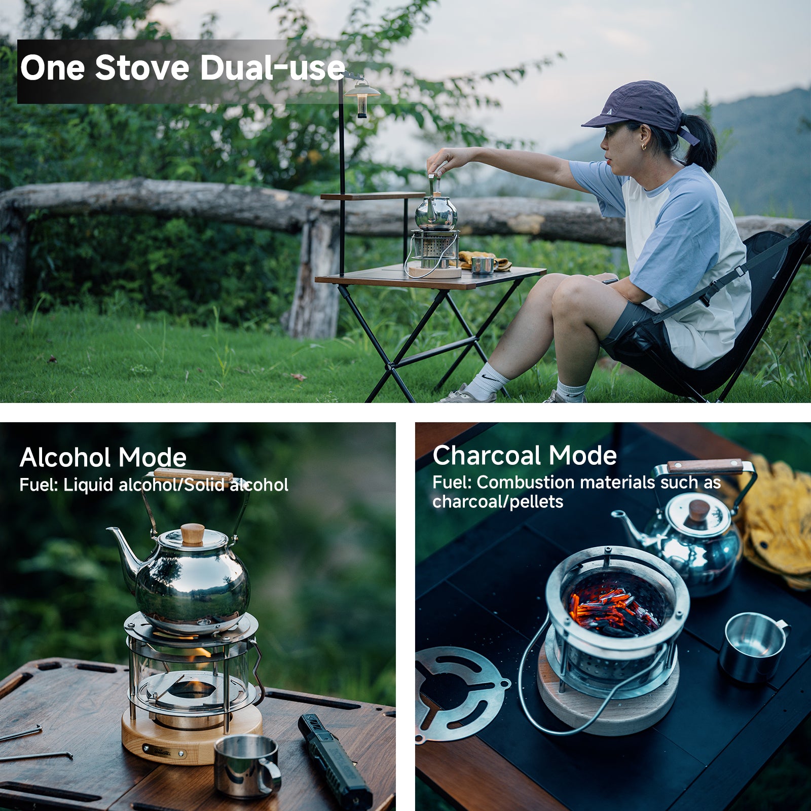 Break tea in alcohol mode for controlled temperature, roast marshmallows in charcoal mode, and chat with friends around the fire, maximizing the camping atmosphere.